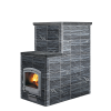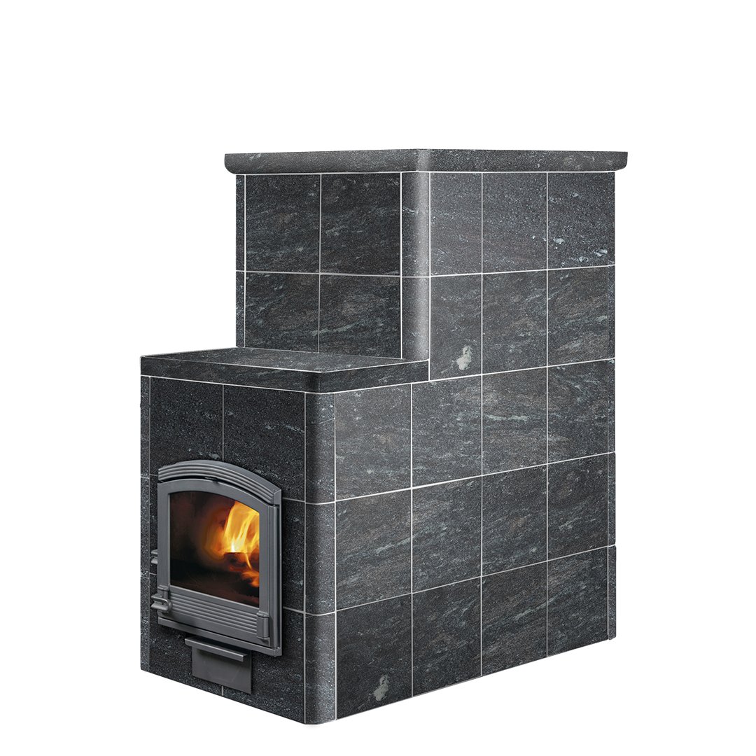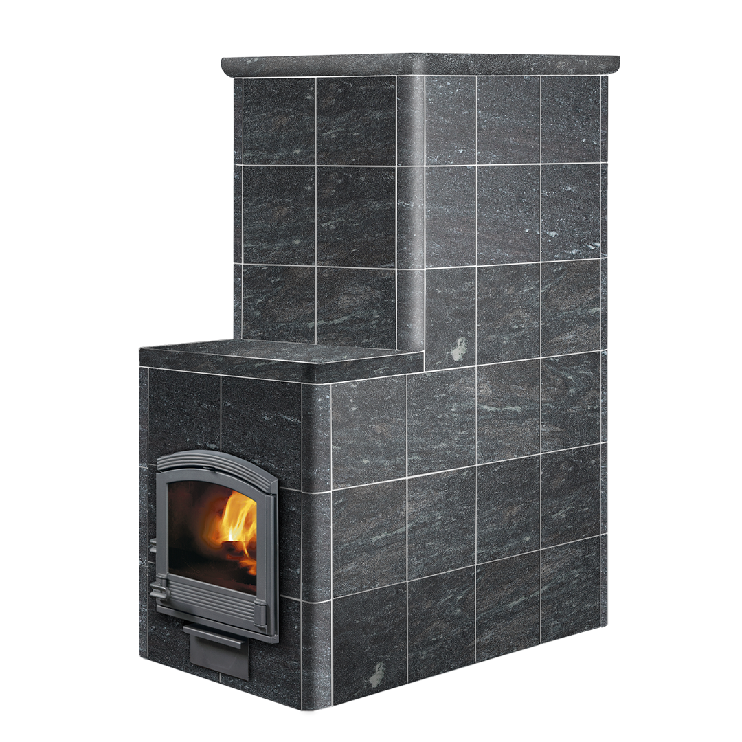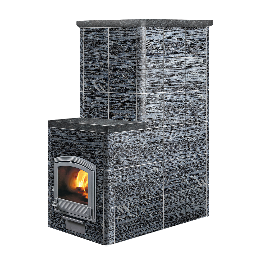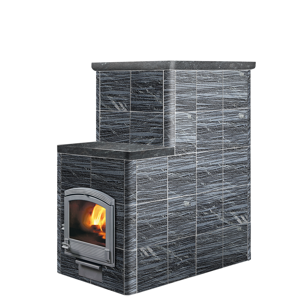 Для отделки доступны разные варианты: колотый камень, Tulikivi Blue, Grafia, керамика или каминные порталы — каждая версия сохраняет природную эстетику и финский стиль.