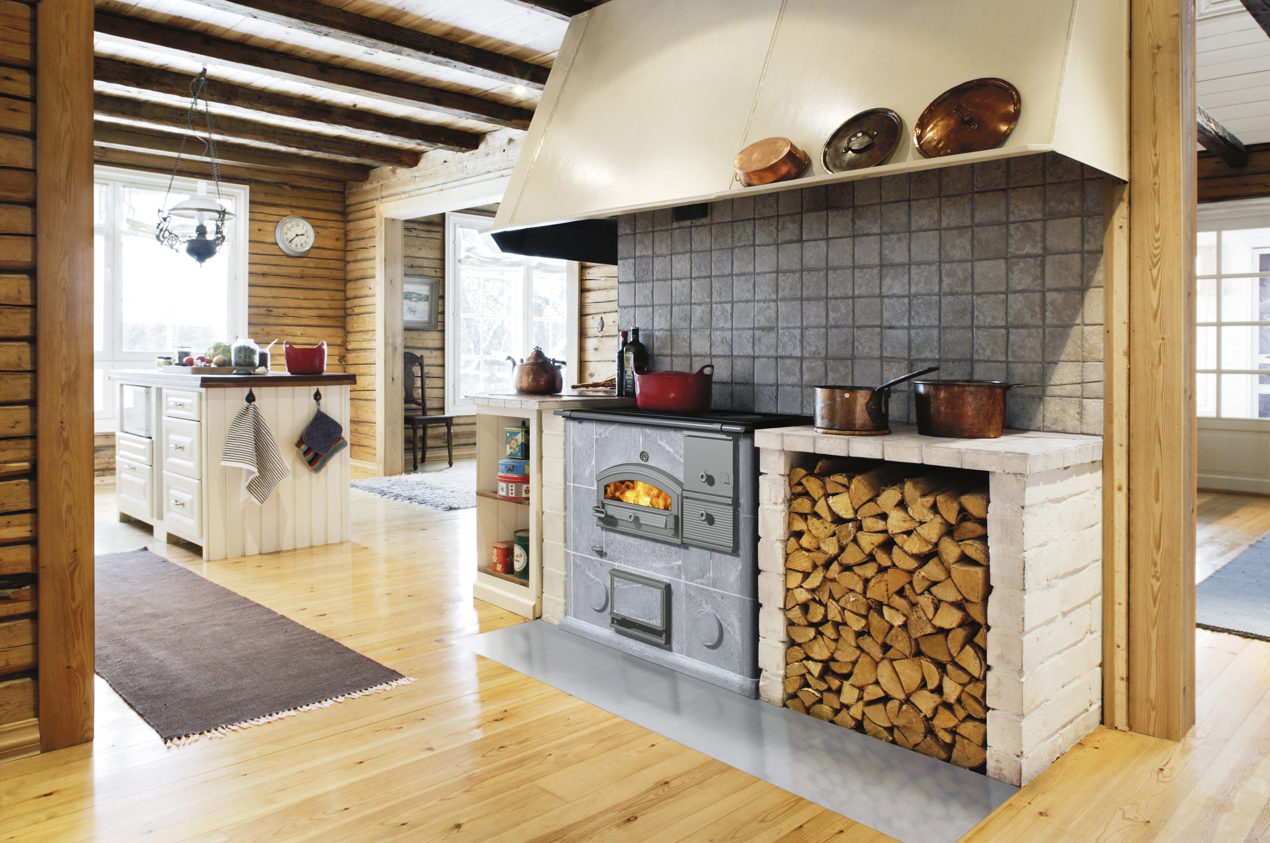 Командный центр кухни — печь с духовым шкафом и плитой, которая варит, жарит и греет. Поверхность плиты сделана из чугуна с эмалированной рамкой. Печь можно присоединить и к одному дымоходу, но рекомендуется подключение к двум дымоходам. Это позволит одновременно использовать духовой шкаф и плиту. Печь быстро нагревает холодный дом или дачу и после этого долго отдает тепло. Печь с плитой и духовым шкафом может стать настоящим многофункциональным центром дачного коттеджа.
