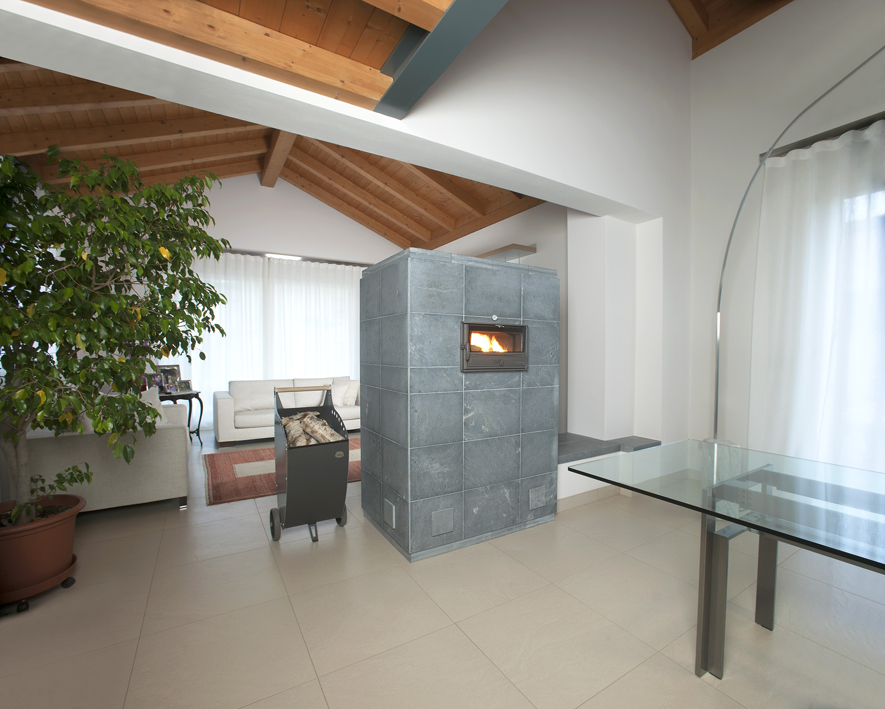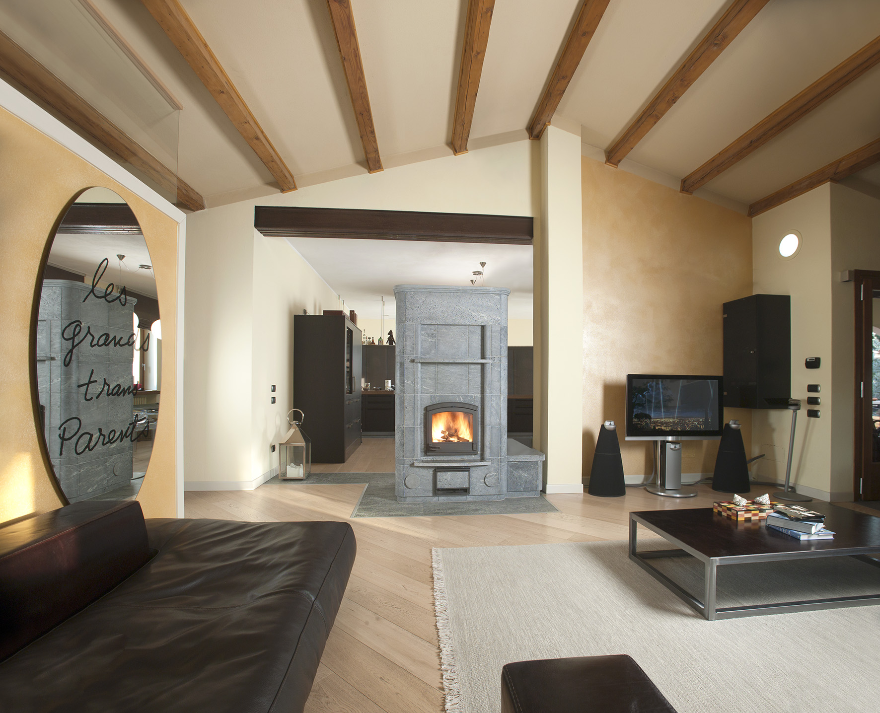 Классическая печь-камин с духовкой, размещенной с обратной стороны. Это позволяет зонировать пространство. Печь можно расположить, например, между гостиной и кухней. Массивная печь весом более 2900 кг обогреет даже большой дом.
