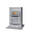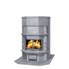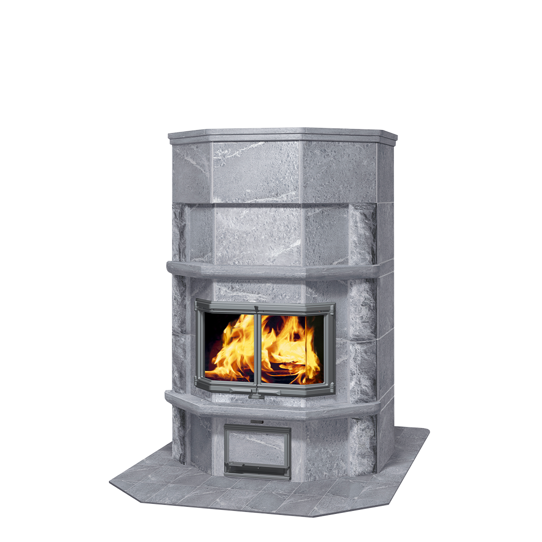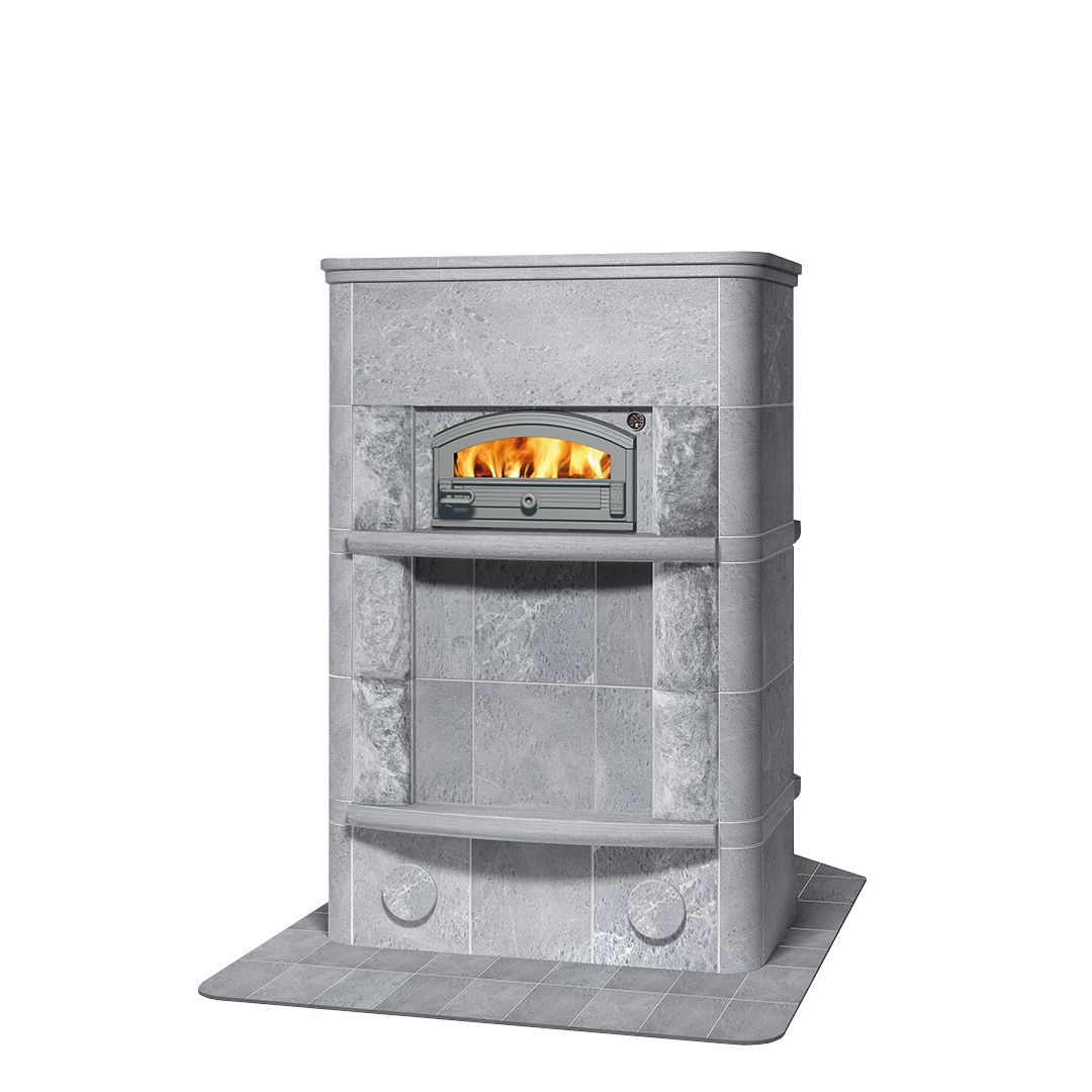 Представительская модель каминных печей Tulikivi с духовым шкафом. Боковые части печи облицованы колотым камнем. Печь легко подстраивается под требования пространства. Духовой шкаф развернут на 180 градусов и выходит на кухню, а большая эркерная дверца — в гостиную.