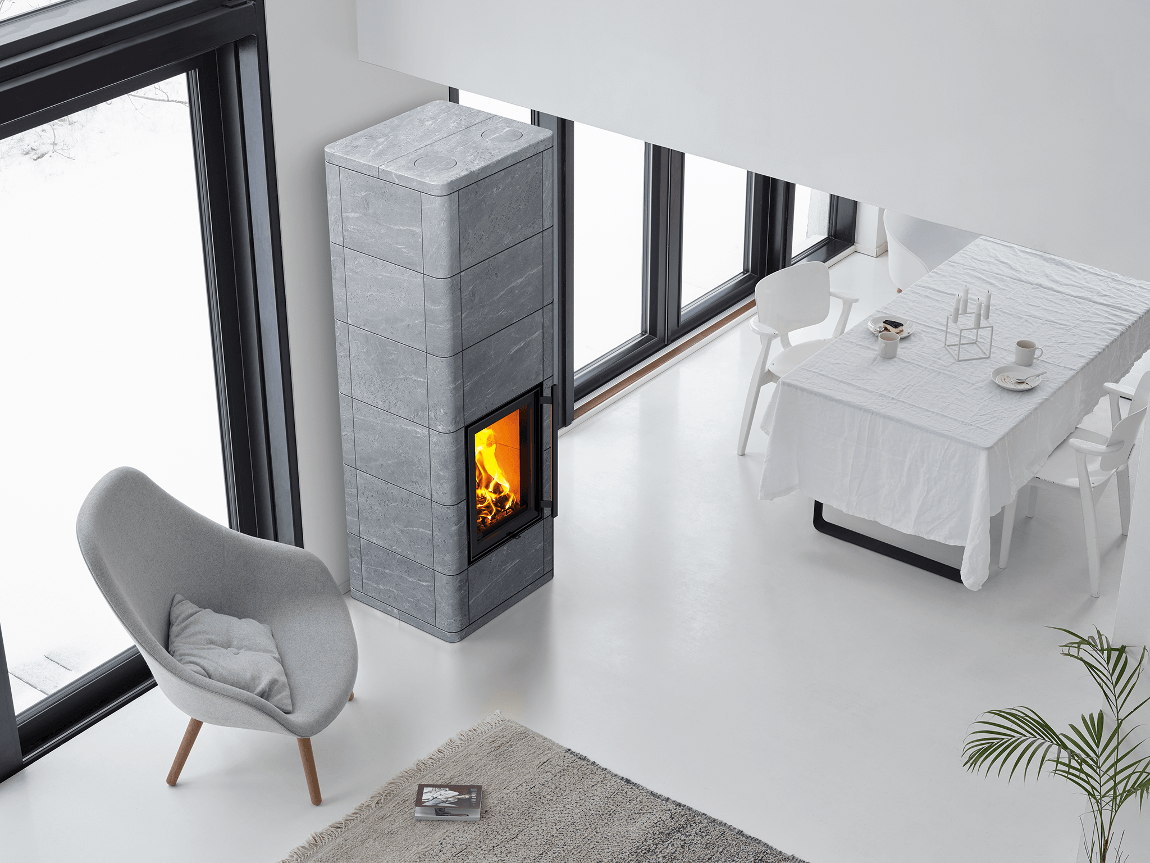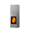 Модели Lampo S и Salvo S — представляют собой два брата-близнеца, отличающиеся размером топочной дверцы. Современность визуального облика Lampo подчеркивается вертикально вытянутой дверцей. Изысканная декоративность достигается с помощью закругленных углов и ритма камня различного размера. В качестве финишной обработки камня можно выбрать два варианта: стандартное матовое шлифование или его можно дополнить отделкой Grafia центральной части печи-камина.