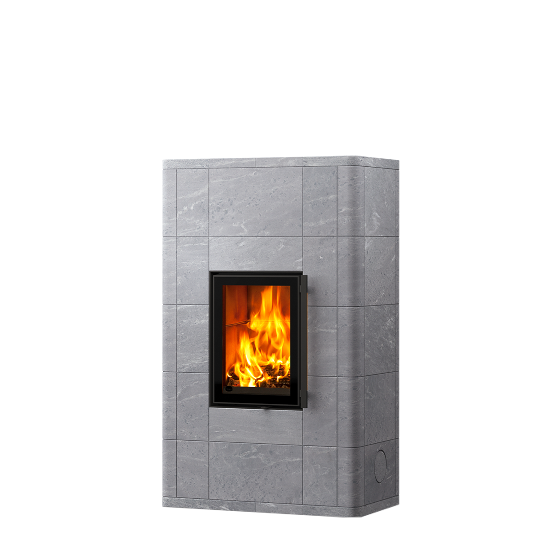 Модели Lampo и Salvo — представляют собой два брата-близнеца, отличающиеся размером топочной дверцы. Современность визуального облика Lampo подчеркивается вертикально вытянутой дверцей. Изысканная декоративность достигается с помощью закругленных углов и ритма камня различного размера. В качестве финишной обработки камня можно выбрать два варианта: стандартное матовое шлифование или его можно дополнить отделкой Grafia центральной части печи-камина.