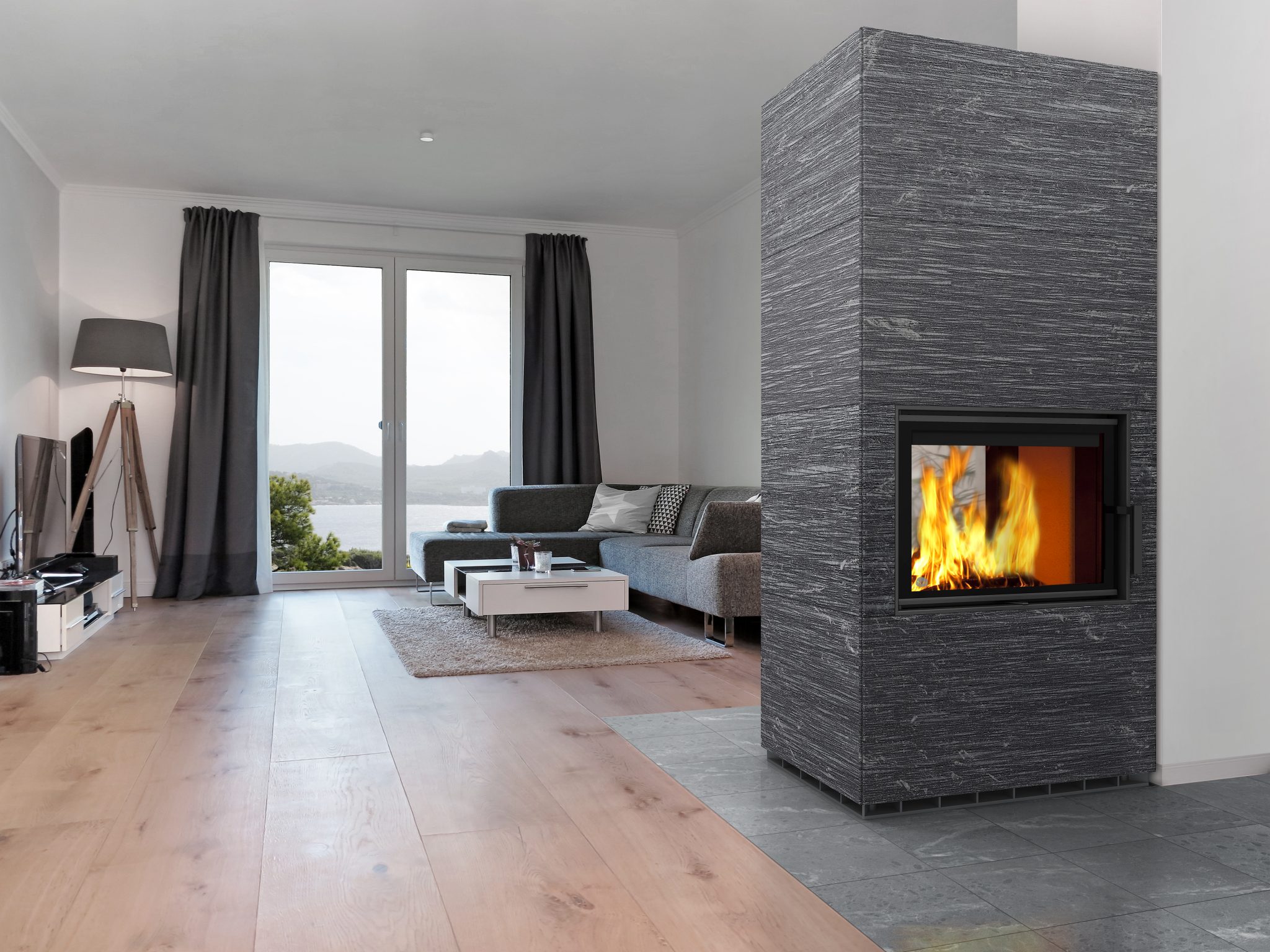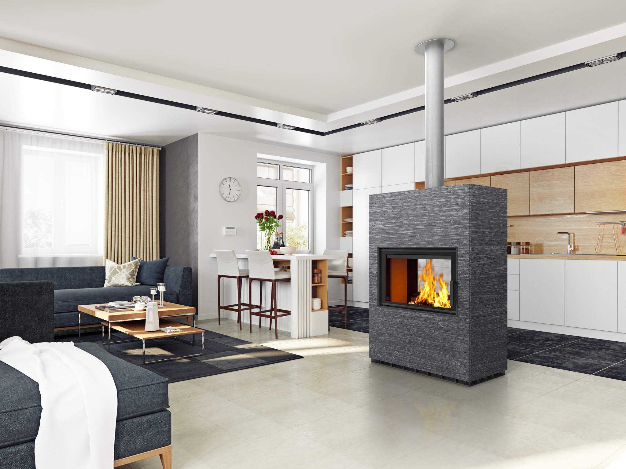 Двусторонний камин LAMU выглядит воздушно и великолепно делит пространство на функциональные зоны. Его большие горизонтальные дверцы приглашают Вас насладиться гипнотическим эффектом огня.