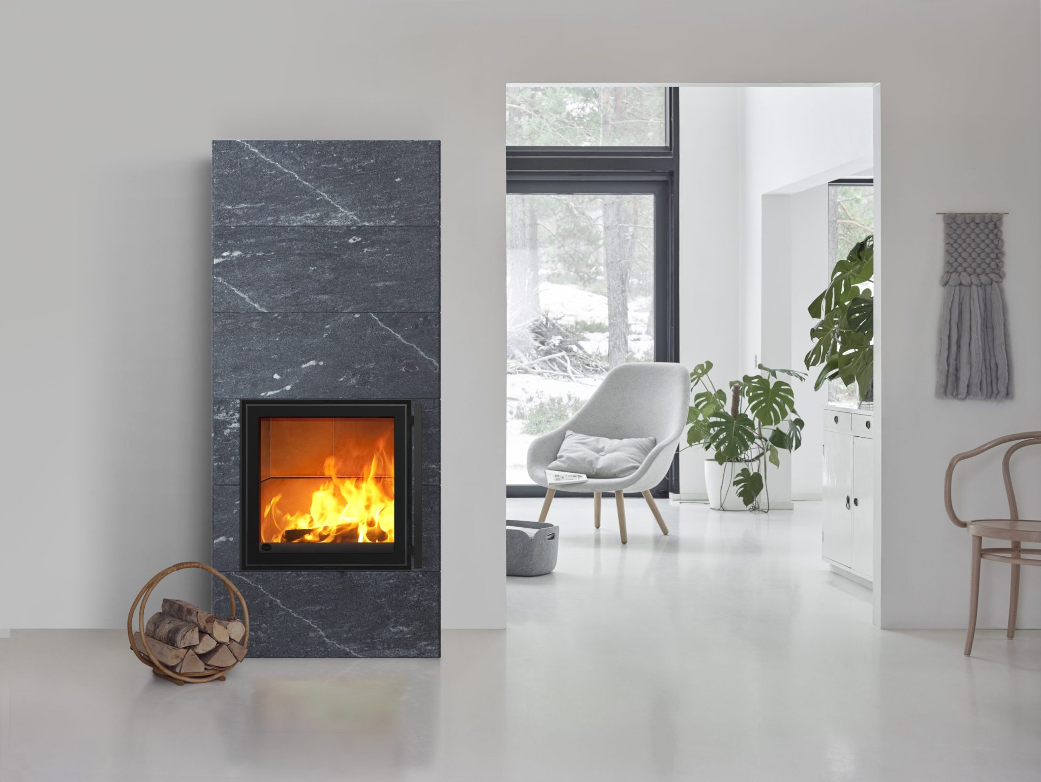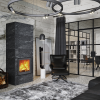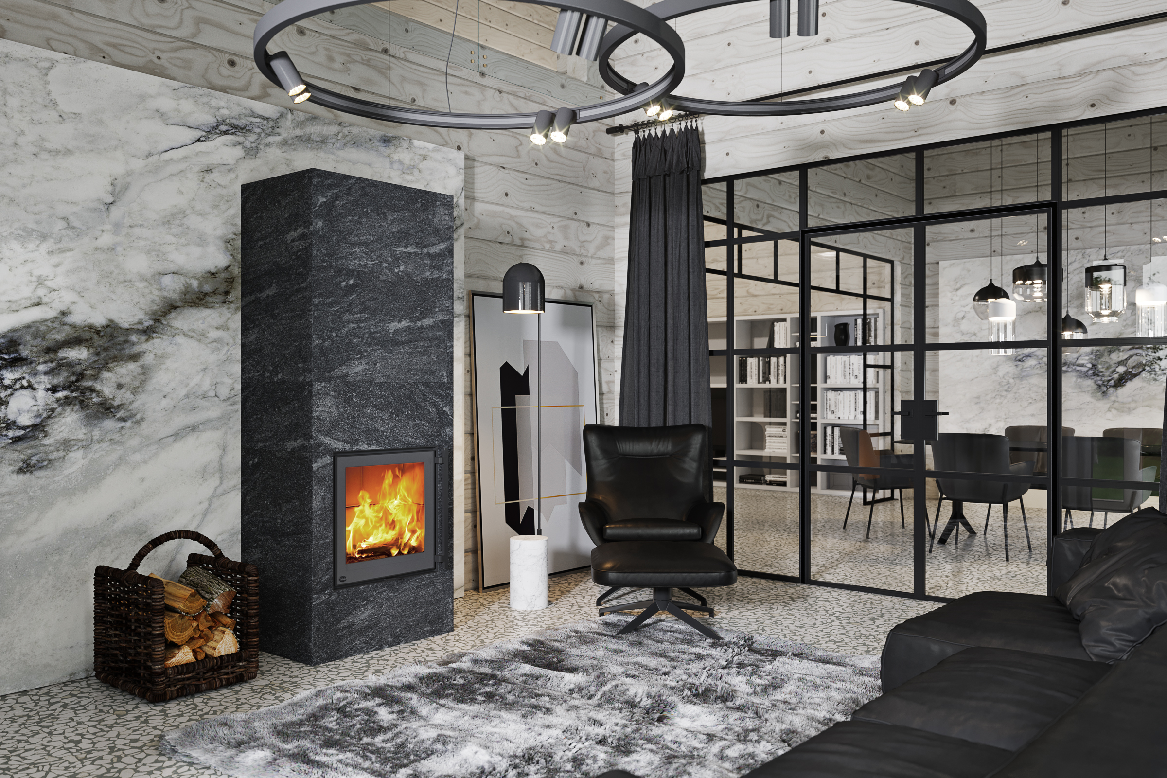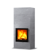 Данная модель имеет узкий корпус без дымовых каналов сбоку, тепло аккумулирует камень Tulikivi вокруг топочной камеры и над ней.