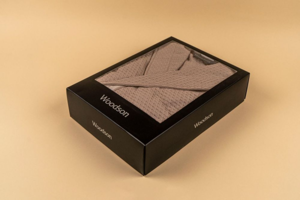Халат с капюшоном средней плотности из 100% премиум хлопка декорирован логотипом Woodson на планке и поясе. Вафельный халат с рисунком звёздочка дополнен накладными карманами. Модель халата идеальна для отдыха после бани как мужчинам, так и женщинам. Соответствие товара европейским нормам безопасности подтверждено международным сертификатом. Плотность — 240 г/м2.