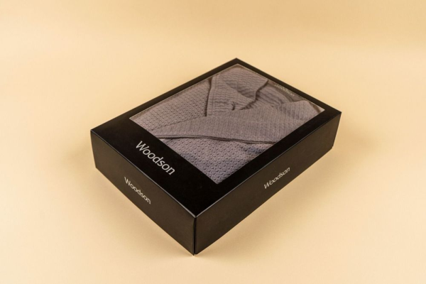 Халат с капюшоном средней плотности из 100% премиум хлопка декорирован логотипом Woodson на планке и поясе. Вафельный халат с рисунком ёлочка дополнен накладными карманами. Модель халата идеальна для отдыха после бани как мужчинам, так и женщинам. Соответствие товара европейским нормам безопасности подтверждено международным сертификатом. Плотность — 240 г/м2.