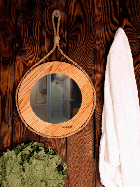Зеркало Woodson из массива дуба отлично смотрится в любом интерьере: предбанника, ванной комнаты и зоны отдыха.